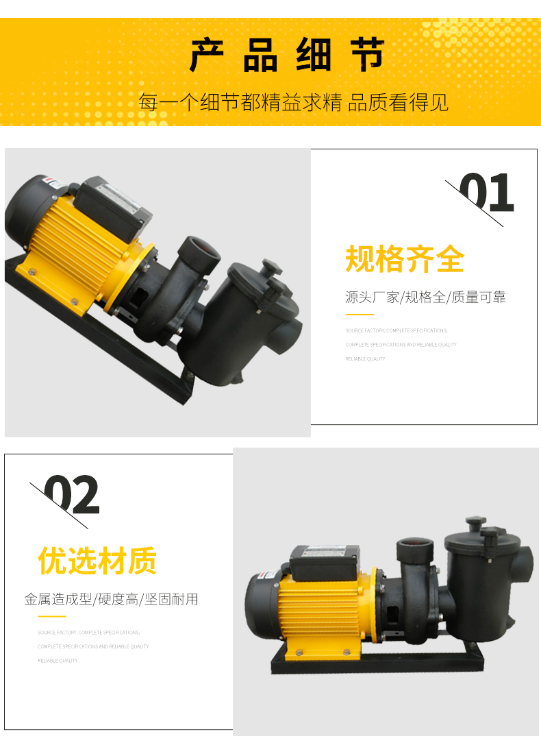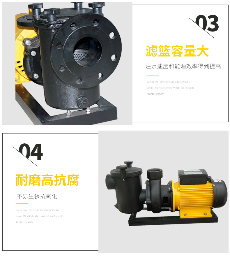 - 根據(jù)水力學原理設計的泵體,用金屬造成型,堅固的一體式結構,經(jīng)久耐用。濾籃容量大,大大減少了清洗工作。性能好,效率高,加快了注水(灌溉)速度并提高了能源效率。適用于各種泳池、工業(yè)用水、海洋館、水上樂園等。